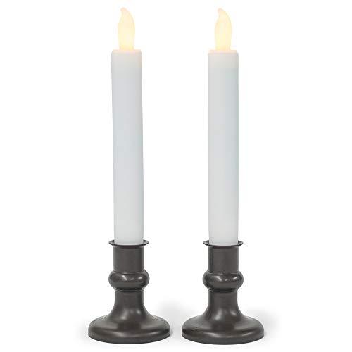 LED Taper With Timer Flameless Candles come as a set of 2; Safe LED light flickers and glows like a real candle. Candles are made of acrylic with antique bronze finish; Each requires 2 AA batteries (not included). Each flameless candle measures approximately 7 inches tall; Features an auto on/off timer so your candle will automatically come on every day at the same time for 6 hours. Perfect for a formal table, mantel, or window during Christmas or any time of the year; Includes two beautiful candle holders and suction cups for convenient display. Ships in protective packaging.